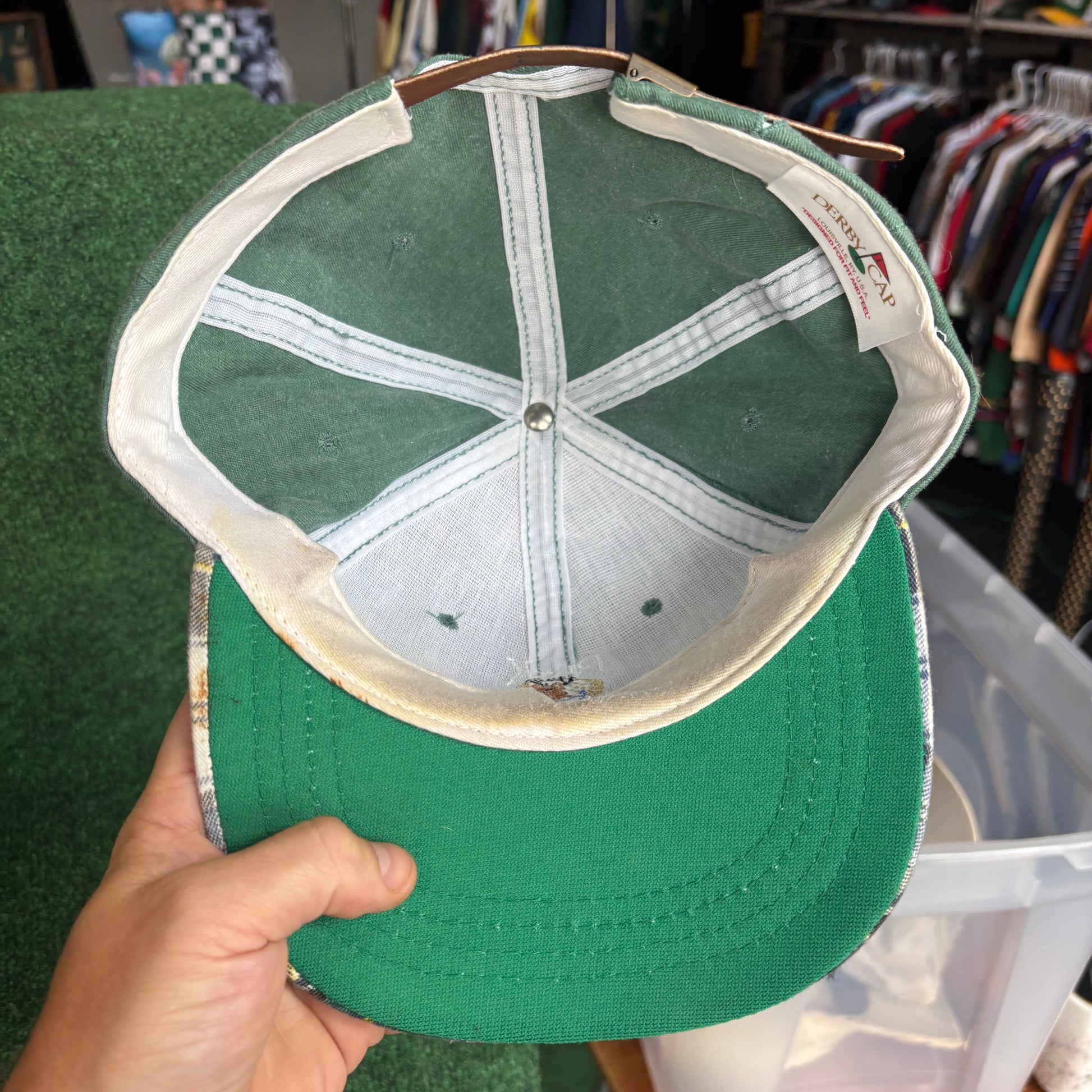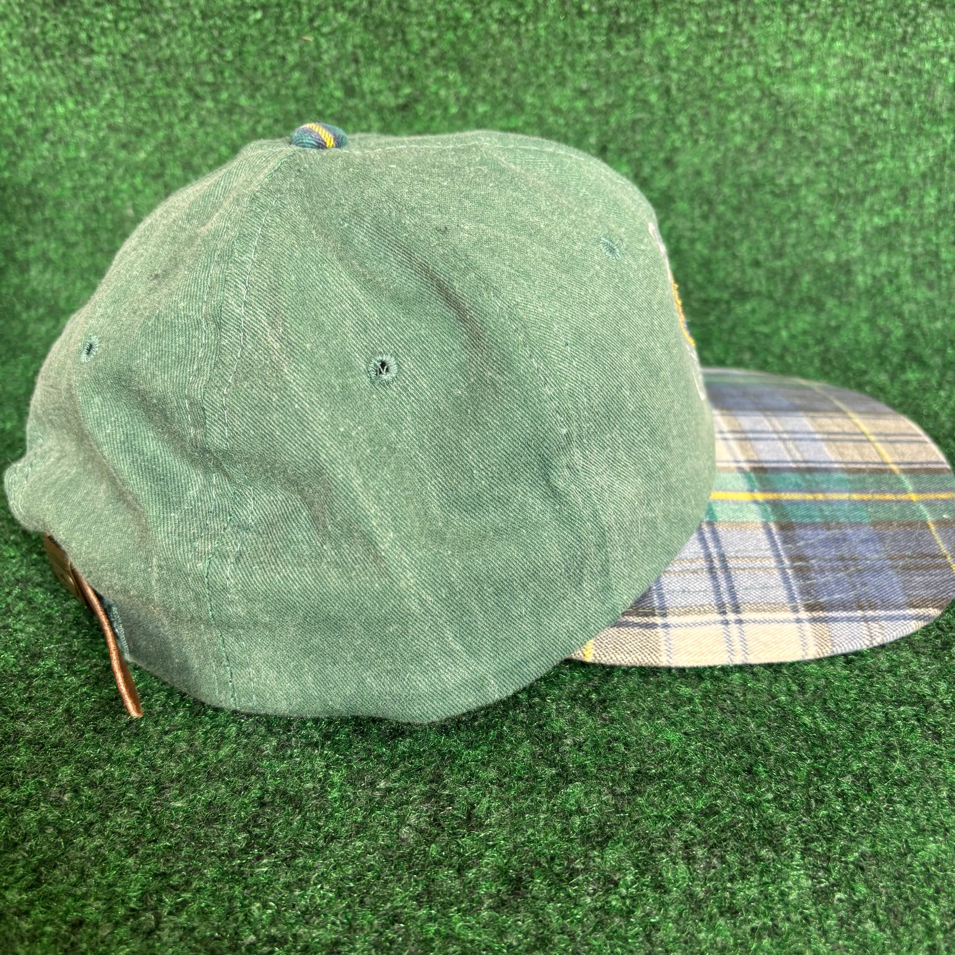 Vintage Buck Creek plaid green leather derby cap strap back